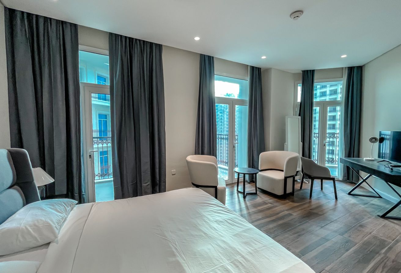 The apartment features a spacious and contemporary living area, finished with high-quality furnishings and elegant fittings throughout. The inclusion of a maid’s room adds valuable flexibility for household staff or additional storage.