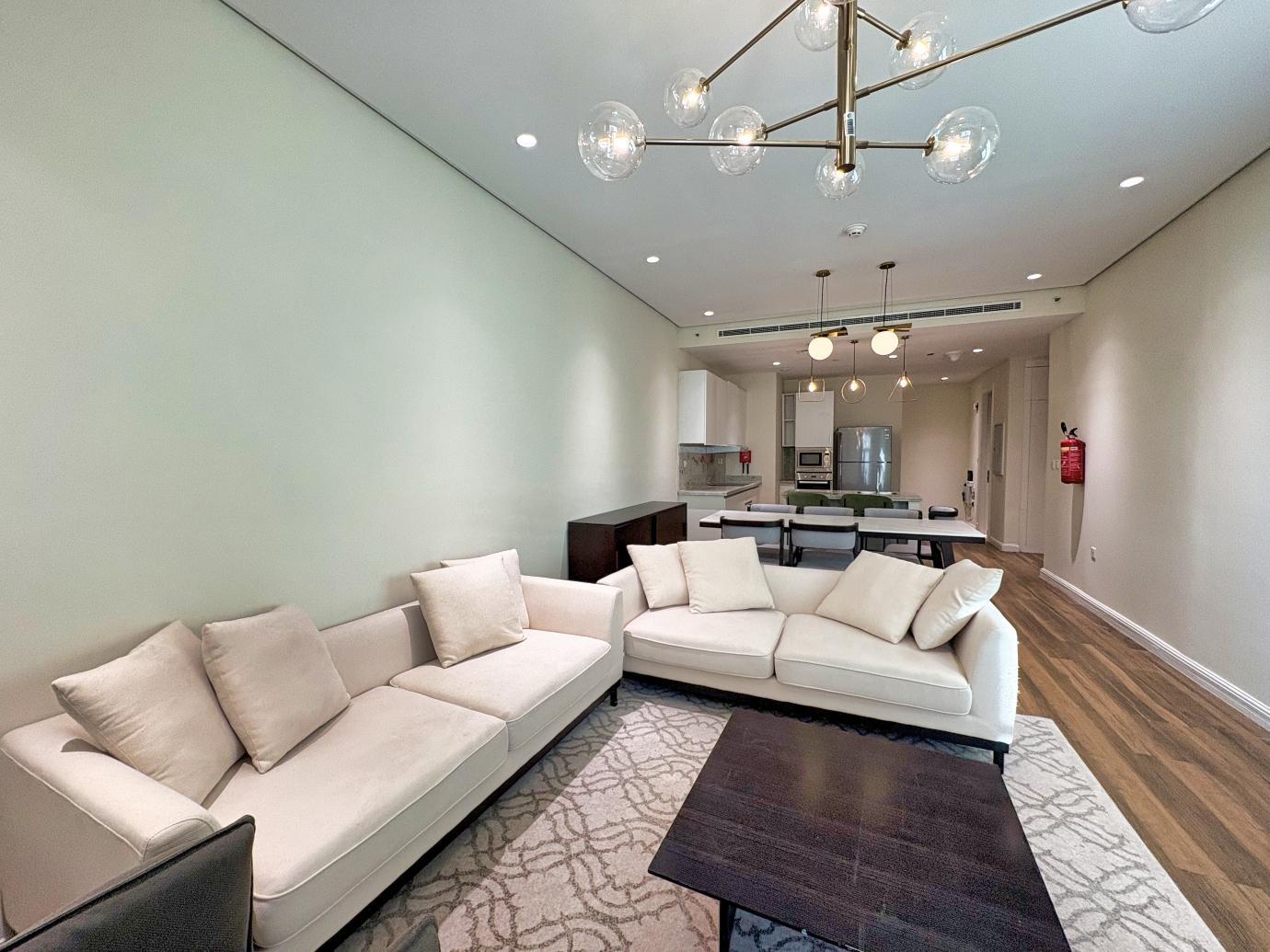 Step into a fully furnished 1-bedroom apartment with an additional office space, designed for comfort and functionality. The open-plan living and dining area is bright and inviting, with large windows and contemporary décor.