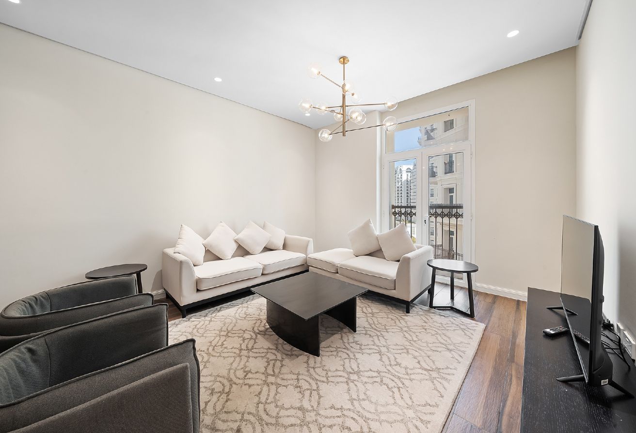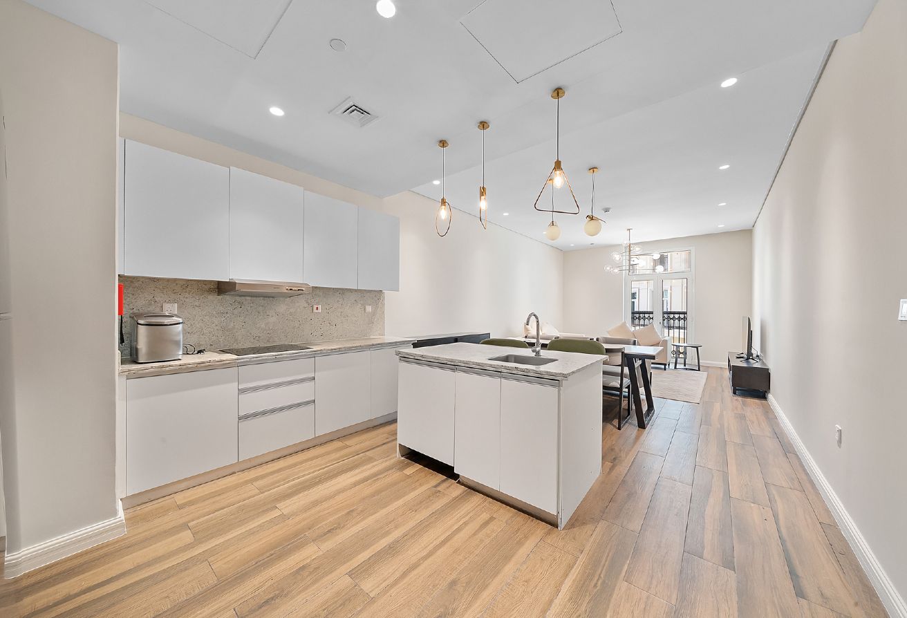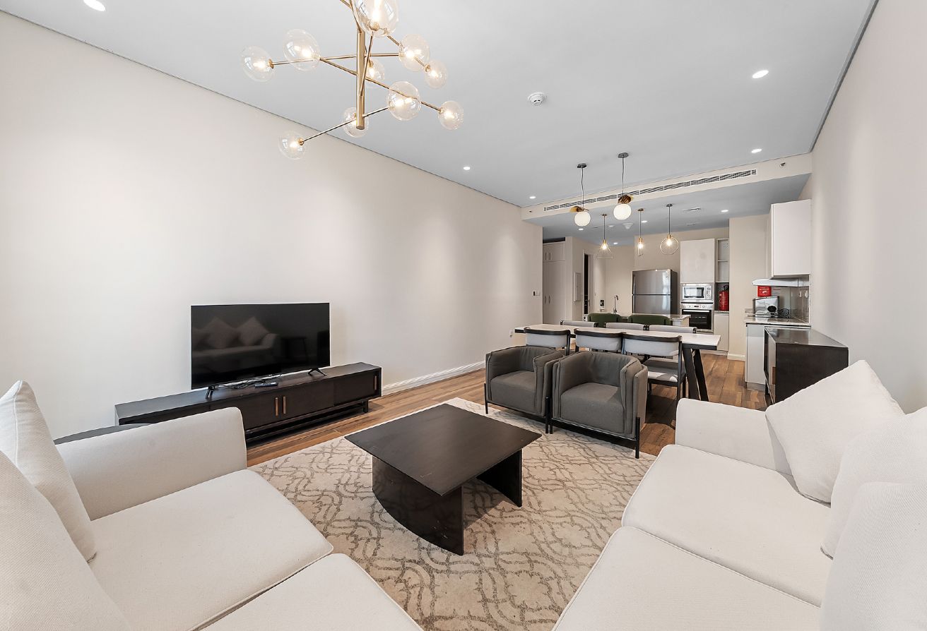 The apartment features two spacious bedrooms plus a maid’s room, perfect for family living or accommodating guests. It includes three modern bathrooms with high-quality fittings. The bright living and dining area is thoughtfully designed for relaxation and entertaining, with large windows offering a pleasant tower view.