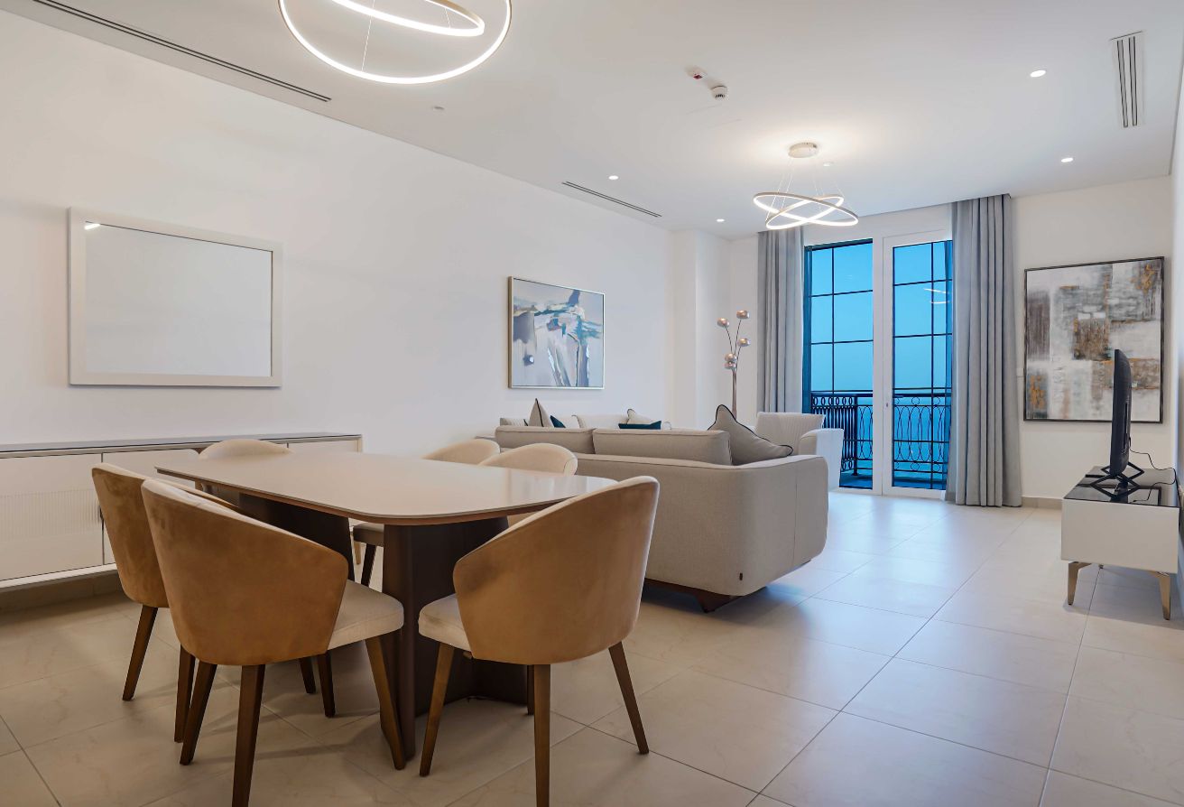 Experience luxury coastal living in this beautifully furnished 2-bedroom apartment with a maid’s room, offering 150 sqm of elegant space. Enjoy breathtaking sea views from your private balcony, perfect for relaxing or entertaining.