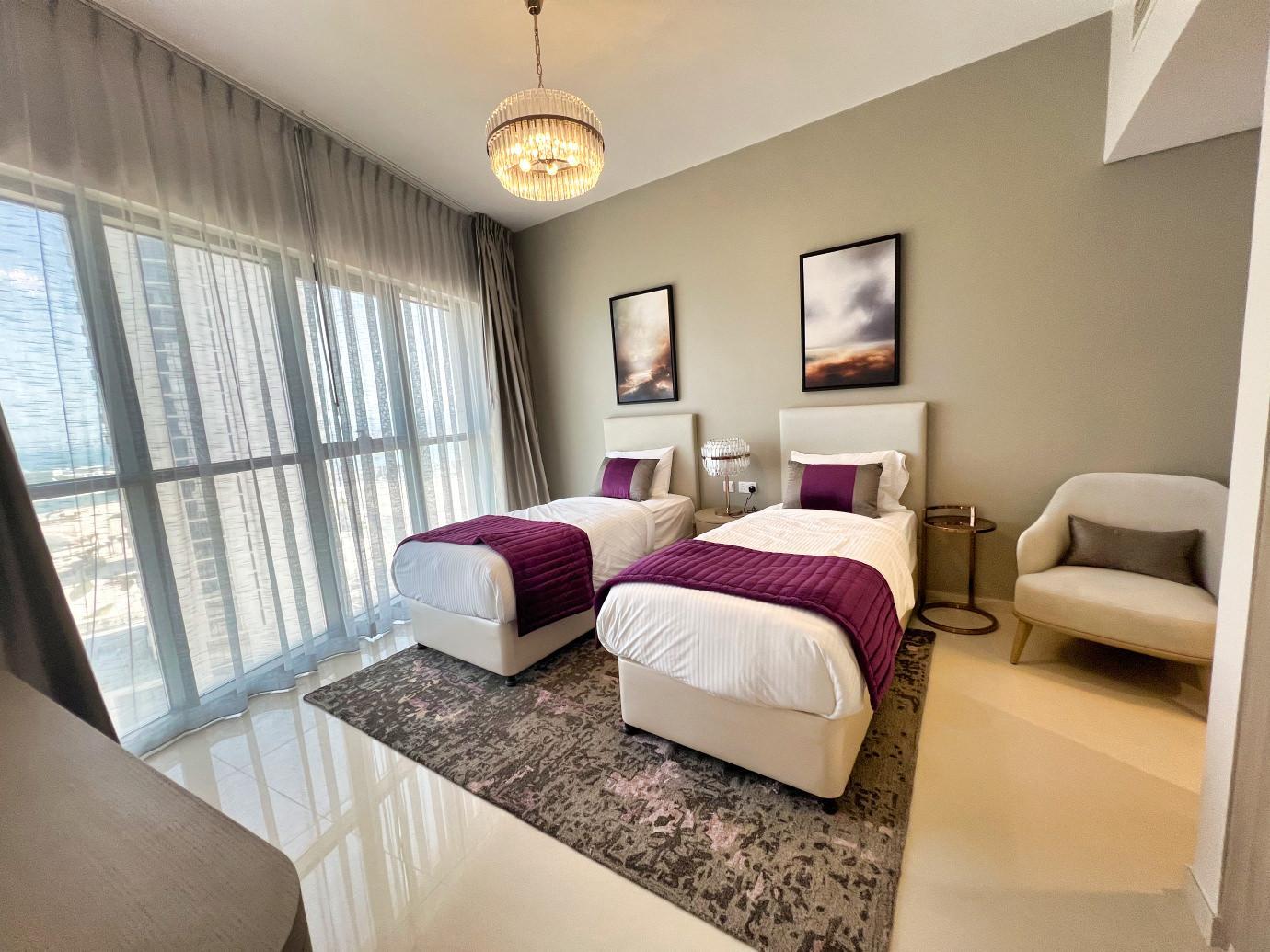 Both bedrooms are generously sized, offering serene sea views and access to the spacious balcony, where you can unwind and enjoy breathtaking vistas of the waterfront. The master bedroom features an en-suite bathroom, while the second bedroom also offers comfort and ample storage. The bathrooms are tastefully designed with modern fixtures, ensuring a chic and refined living experience.