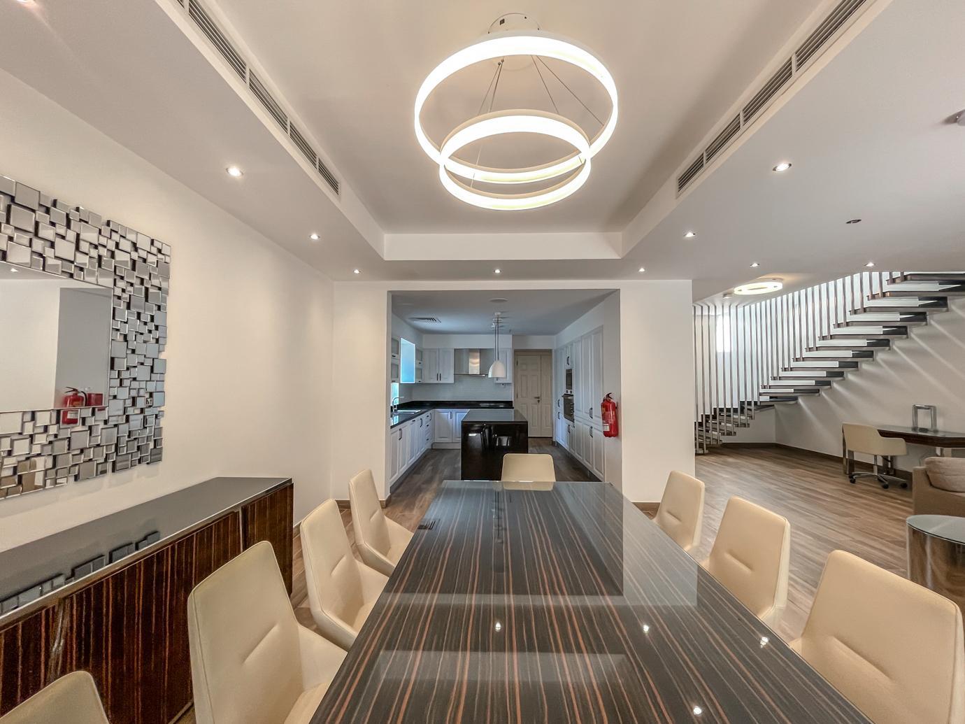 As you step into the villa, you'll be greeted by a bright and airy living room, furnished with elegant and clean furniture. The dining area is located adjacent to the living room, and features a stylish table with seating for ten.